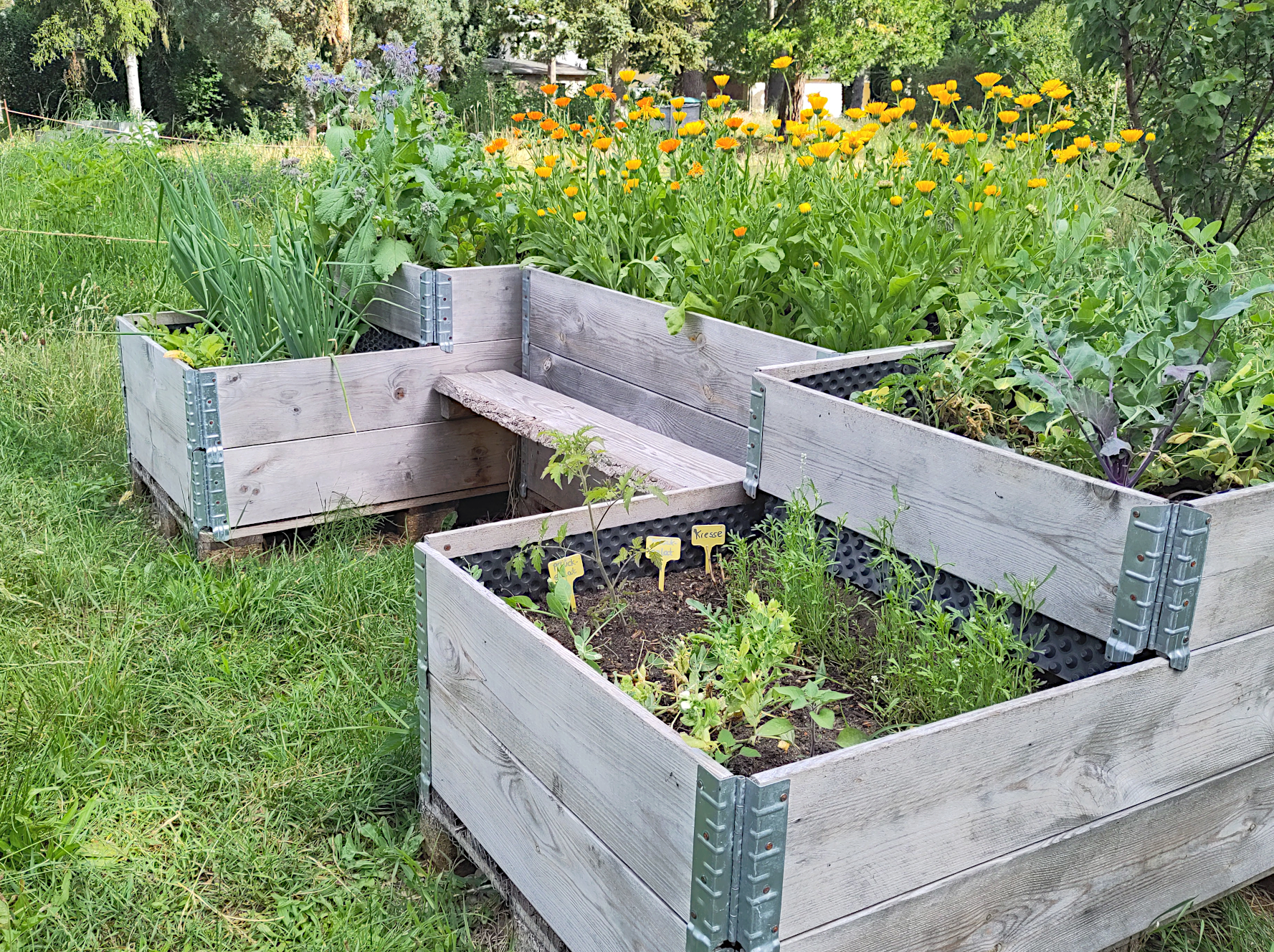 Zum Schluss wurde eine 20 cm dicke Schicht Pflanzboden aufgetragen, die bereits mit 30% Kompost vermischt war und darauf eine Mischkultur gepflanzt. So können wir viele unserer Gemüsepflanzen auf der kleinen Grundfläche anbauen.
