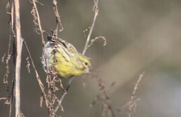 In der Nähe der anderen Vögel, die an den verschiedenen Futterstellen aktiv sind, frisst dieses Girlitz Weibchen seit einigen Tagen viel lieber die Samen von Wildkräutern und hält sich dabei vor allem bodennah im hohen Gras oder Unterholz auf.