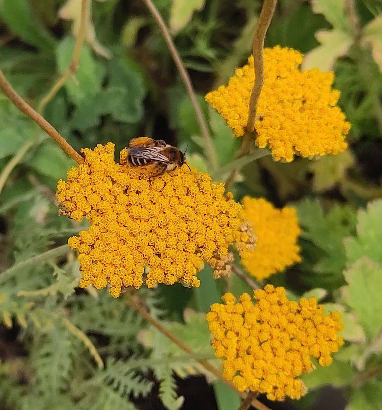 Hier sitzt die Wegwarten-Hosenbiene (Dasypoda hirtipes) auf der Goldgarbe (Achillea filipendulina), welche sich für uns auch als Trockenblume gut eignet, da sie ihre leuchtende Blütenfarbe beibehält.
