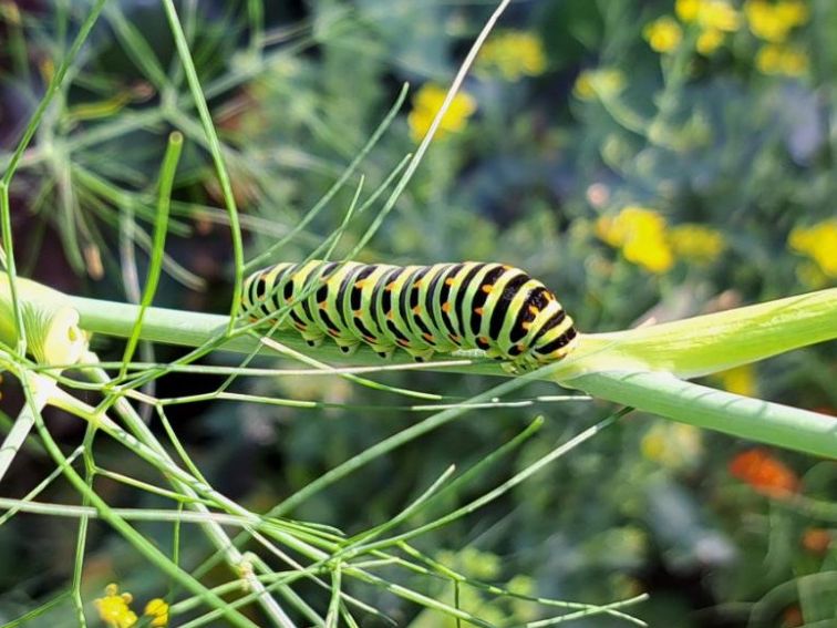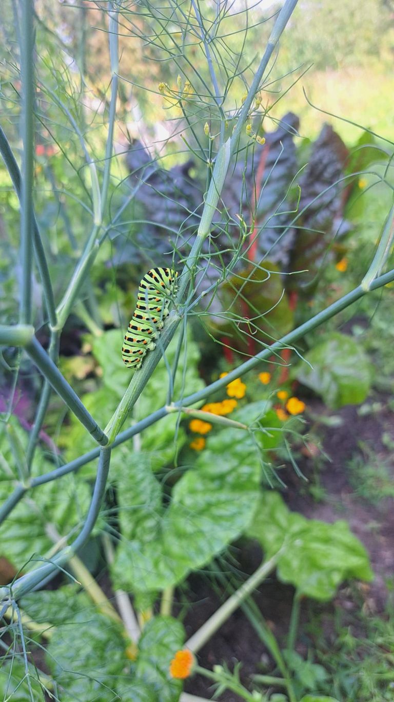 Die Raupe des Schwalbenschwanzes bevorzugt aromatische Doldenblütler wie diesen Knollenfenchel oder Möhren als Nahrungsquelle. Beides findet der Falter zur Eiablage in Einzelstellung in unseren Mischkulturbeeten. Nach der letzten Häutung verpuppt sich die Raupe an einem trockenen Pflanzenstengel und kann grün oder auch grau-braun aussehen.